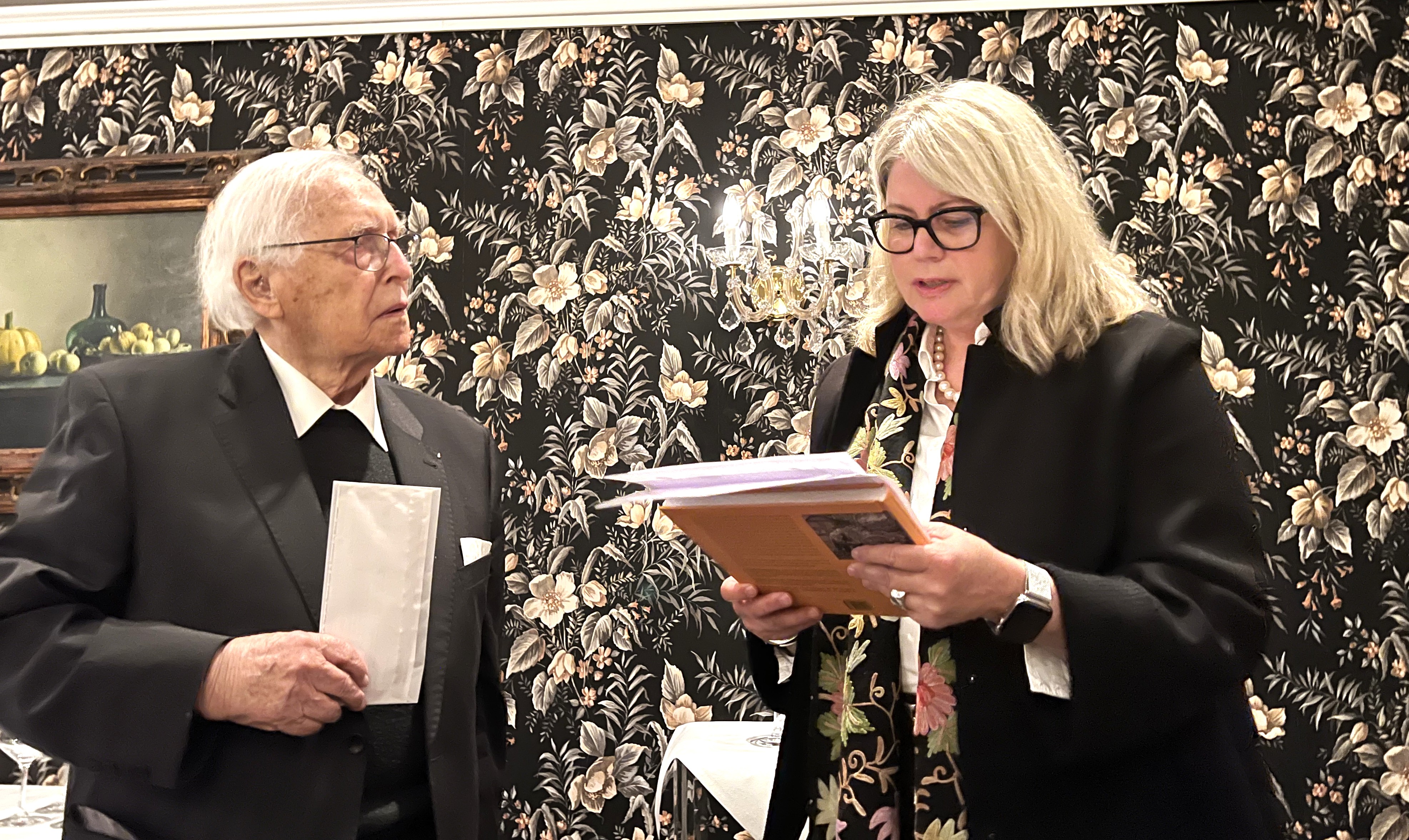 Der zweite Geehrte, Prof. Dr. Karl Wilhelm Dahm (*1931), wirkte als Hochschullehrer an der Universität Münster und führte hier den Lehrstuhl für christliche Gesellschaftswissenschaften. Lions-Freund ist er seit 1969. In ihrer Laudatio hob DG Engels-Stirm die Verdienste Dahms hervor: „Wertvoll war, dass er sich schon früh im Kreise der noch wenigen Lions-Clubs in Deutschland intensive Gedanken über die Rolle, die Aufgaben und die Verpflichtungen der Lions machte und seine Gedanken zu ‚Funktionseliten in der Gesellschaft‘ in die Diskussion brachte. Dahm hat ganz wesentlich zur Bildung eines differenzierten Selbstverständnisses innerhalb des Clubs beigetragen, die Aufgaben nach außen – und die Freundschaft nach innen als Anker der Gemeinschaft betont.“ Weiter wies DG Engels-Stirm auf die Verdienste Dahms in der Zusammenarbeit mit dem LC Enschede hin. Hier spielt besonders die enge Freundschaft zu unserem niederländischen LF Herbert Zwartz eine wichtige Rolle: „Wissen muss man, dass Herbert F. Zwartz zu den etwa 1.000 jüdischen Menschen zählt, die durch den Mut und das Bekennertum des reformierten Pfarrers Leendert Overduin (1900-1976) vor der sicheren Ermordung durch die Nazis gerettet wurden. Der Geistliche organisierte das Untertauchen so vieler Menschen in niederländischen Familien, half durch Lebensmittelversorgung und Dokumente. Zu Overduin und seinem Werk ist in den Niederlanden ein Buch erschienen mit dem Titel: Das Gewissen einer Stadt. Es ist der Initiative von Karl-Wilhelm Dahm in Verbindung mit Herbert F. Zwartz zu verdanken, dass die von Arnold Bekkenkamp verfasste Schrift nunmehr ins Deutsche übersetzt und veröffentlicht wurde. LC Münster hat das Erscheinen durch einen Druckkostenzuschuss möglich gemacht.
